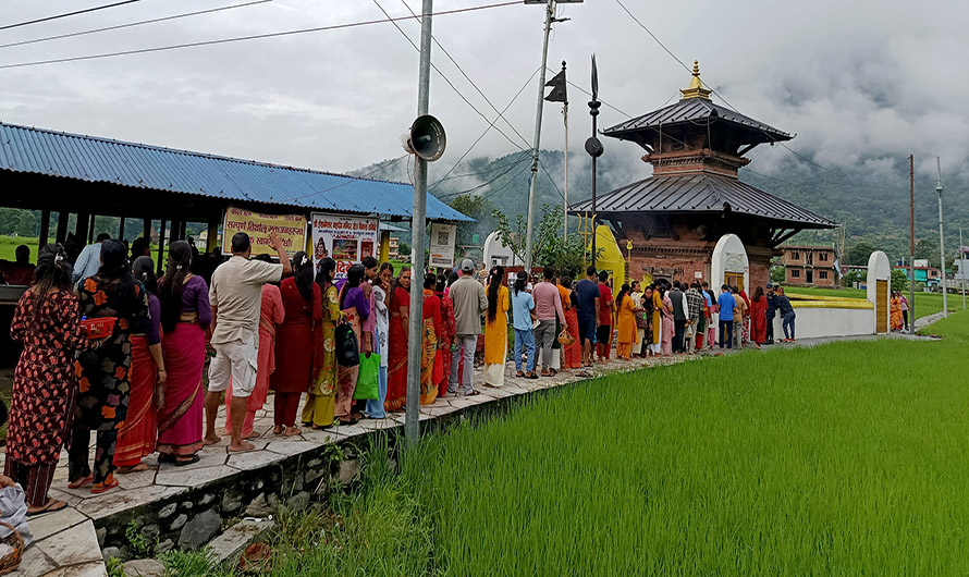 लमजुङको मध्यनेपाल नगरपालिकाको करापुटार ईशानेश्वर महादेव मन्दिरमा आज पूजा आराधना तथा दर्शन गर्न लामवद्ध भएका भक्तजन ।