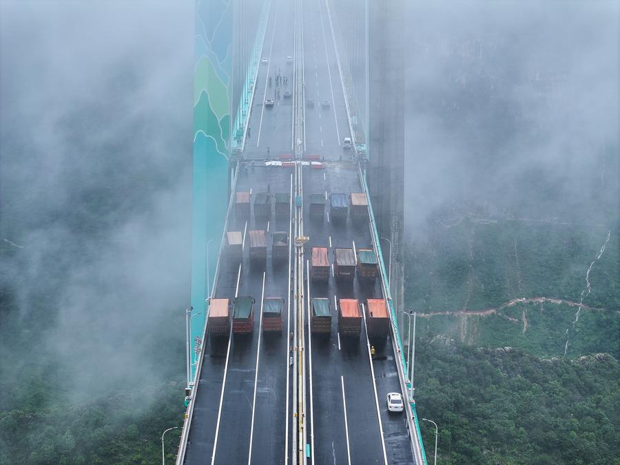 अगस्ट २१ मा लिइएको यो हवाई ड्रोन तस्बिरले दक्षिणपश्चिम चीनको गुइझोउ प्रान्तको हुआजियाङ ग्रान्ड क्यान्यन ब्रिजमा लोड परीक्षण गरिएको सिन्हवाले जनाएको छ ।